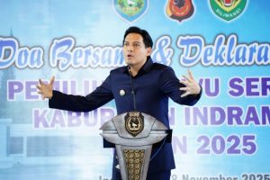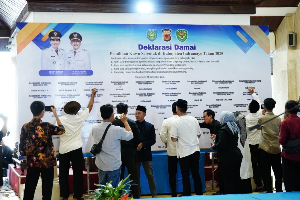 Komitmen tersebut ditegaskan oleh 482 calon Kuwu dari 139 desa se-Kabupaten Indramayu melalui ikrar dan penandatanganan Deklarasi Damai Pemilihan Kuwu Serentak Tahun 2025 yang digelar di Pendopo Indramayu, Jumat (28/11/25).