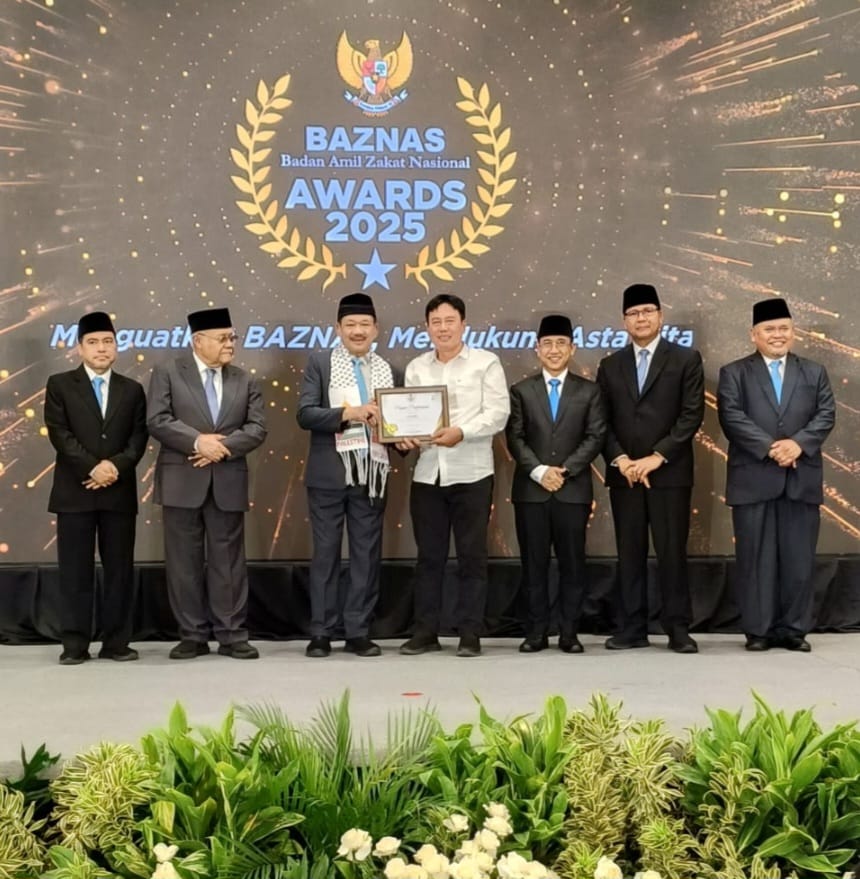 Penghargaan diserahkan oleh Ketua BAZNAS RI, Prof. KH. Noor Ahmad, didampingi para pimpinan BAZNAS dalam BAZNAS AWARD 2025 di tengah Rakornas BAZNAS yang digelar di Hotel Mercure Ancol, Jakarta, pada Kamis (28/8/2025).